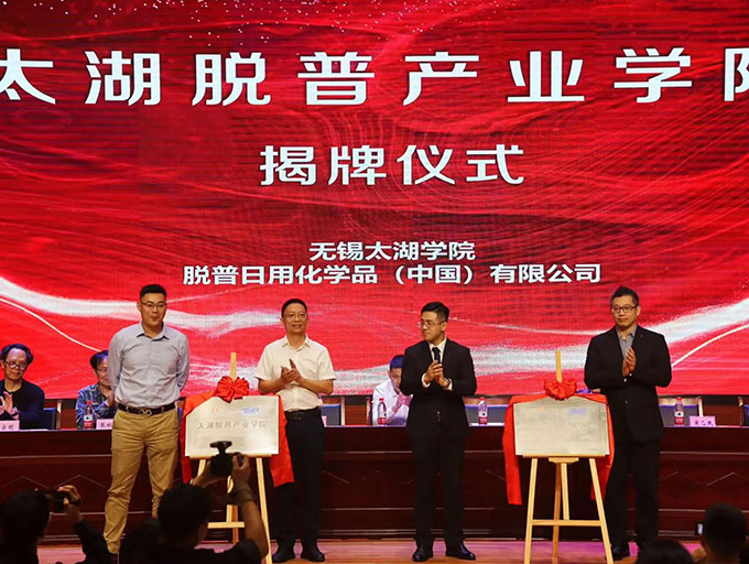 陈鹏飞副校长、冯益民副主任、洪伟伦副总裁、黄乙民厂长共同为“太湖脱普产业学院”进行了揭牌。