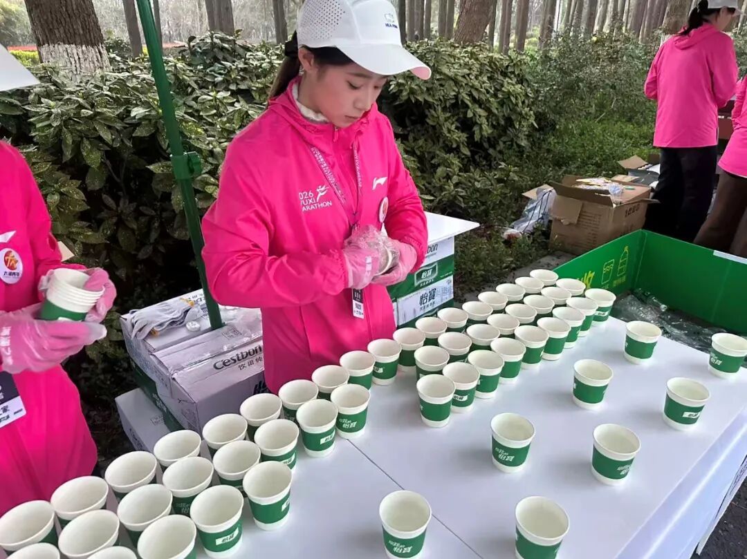 随着赛事鸣枪起跑,赛道补给组的志愿者们化身赛道上的能量补给站。凌晨4:30志愿者们便集结出发,抵达点位后迅速完成场地布置与物资摆放。比赛中,他们及时为跑者递上补给,同步清理赛道、维护秩序,用快速贴心的服务为选手续航,成为赛道上最坚实的后盾。