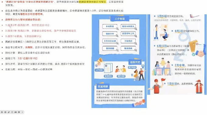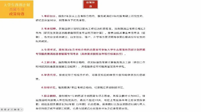 紧接着,分享人王志炟详细解读西部计划西藏专项的政策待遇。在考研方面,服务2年及以上且考核合格的志愿者,服务期满后3年内报考硕士研究生,初试总分加10分 ,同等条件下优先录取;考公等方面,参加西部计划且目前无工作经历的志愿者,服务期满且考核合格后2年内,在参加机关事业单位考录等方面,可同等享受应届高校毕业生的相关政策。此外,还提及了专项考试、工龄计算、学费代偿、职称评定、探亲假期等优惠政策。同时,他介绍了生活补贴情况,志愿者服务期间,中央财政和西藏地方财政会保障工作生活补贴,根据海拔区域不同,补贴也有所不同,还有完善的社保、商业保险及住宿保障。