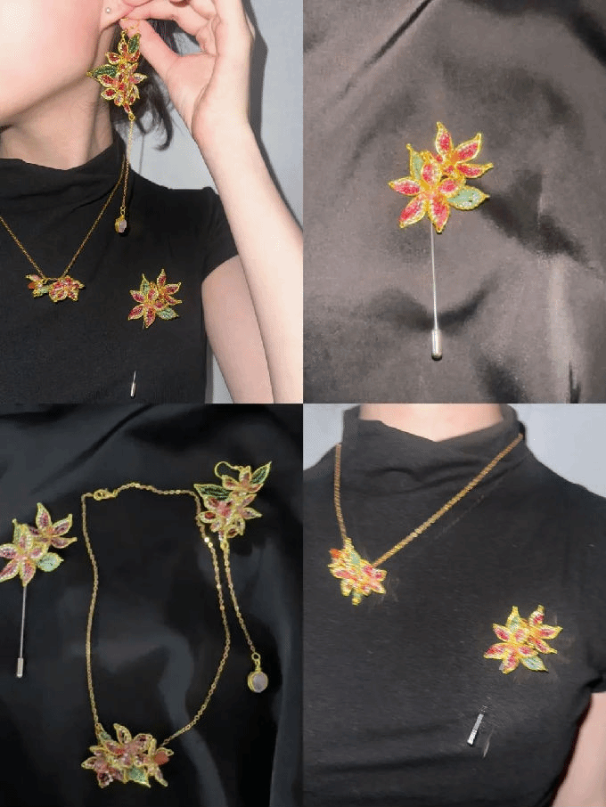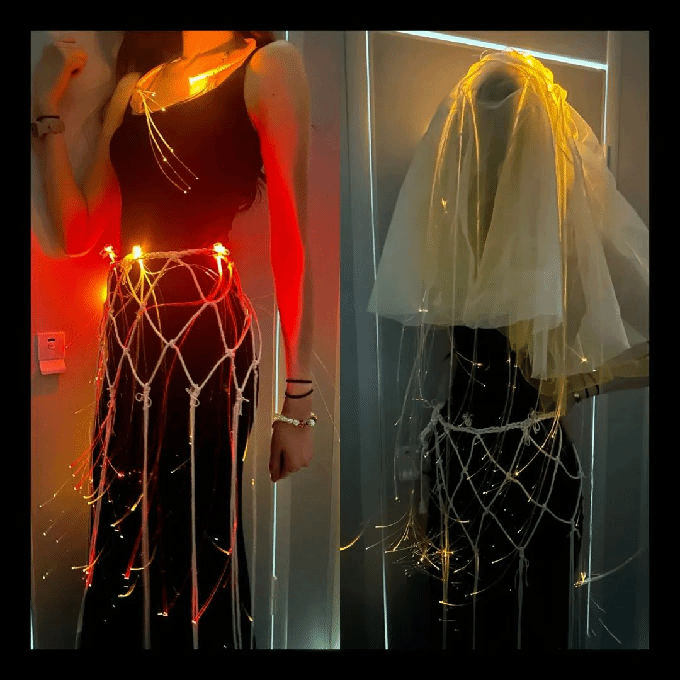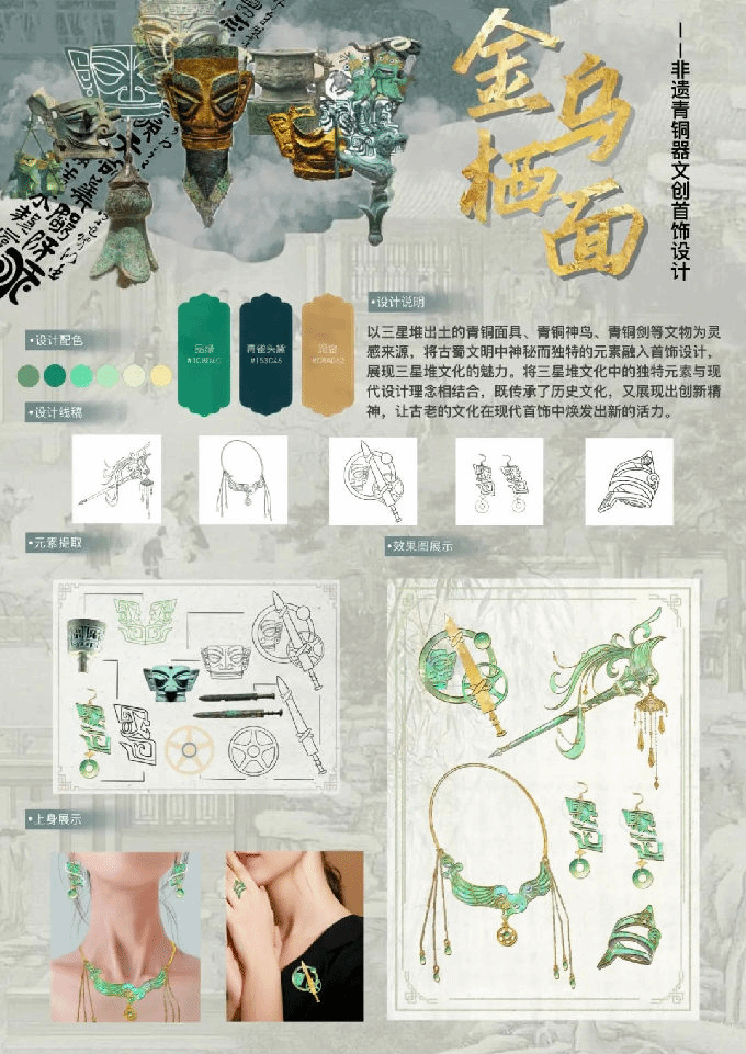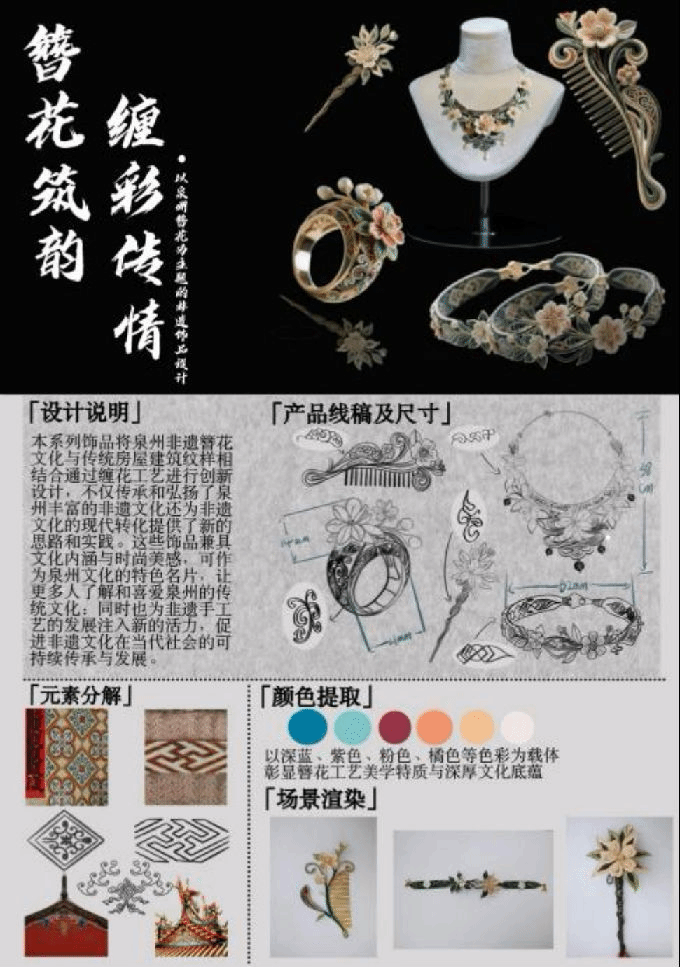 在陈寒佳老师和林琦琪老师授课的服装与服饰设计 2303 班和 2304 班的《服饰配件设计》课程中,两位老师指导学生使用AI关键词生成多组创意图片,为配饰设计提供了更多创意图集,在此基础上根据设计主题进行细节修正,并最终根据设计稿做出系列配饰或文创的成品。