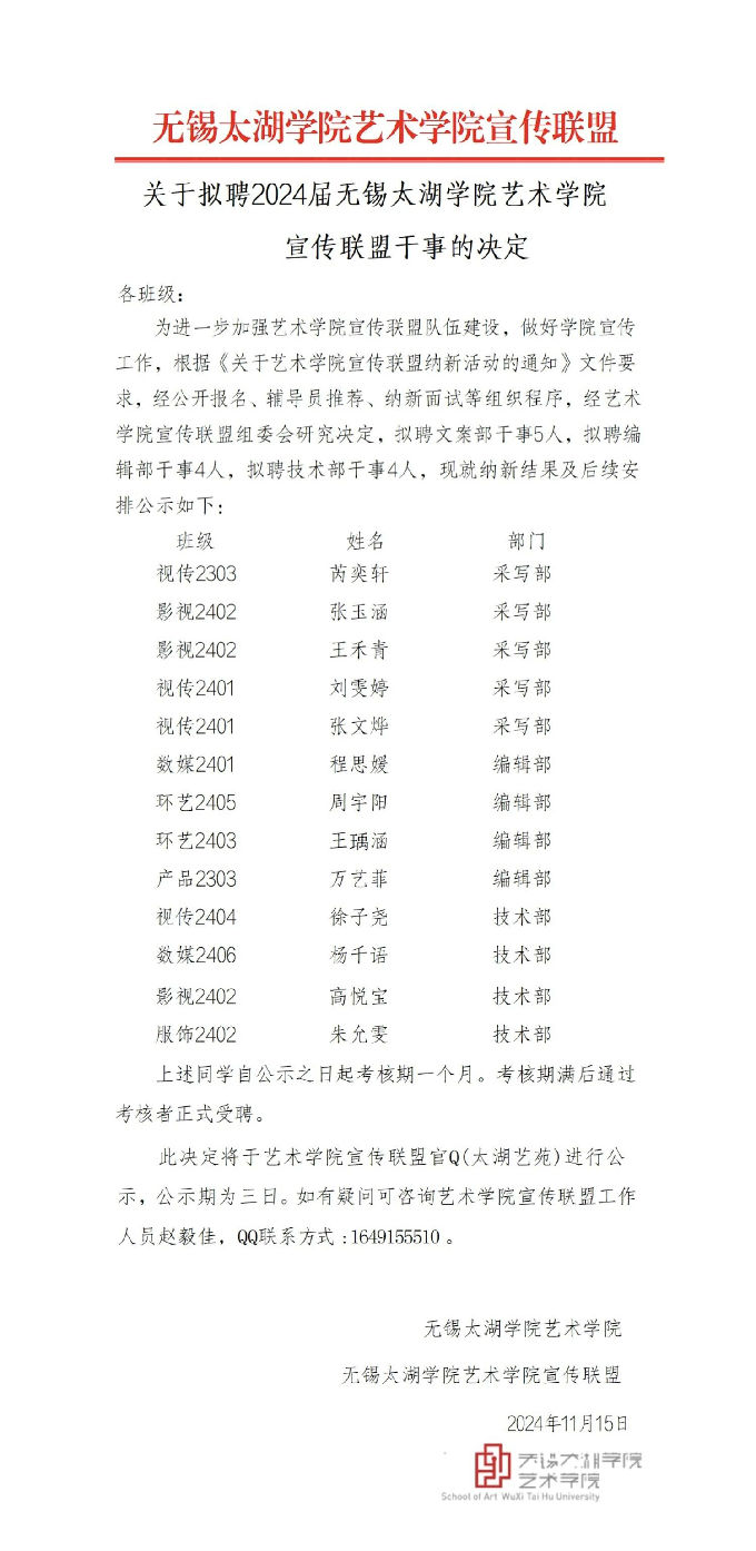 关于拟聘2024届无锡太湖学院艺术学院宣传联盟干事的决定