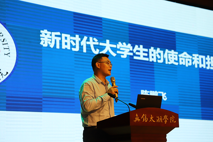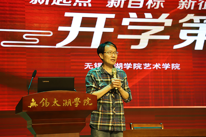 首先,陈鹏飞副校长代表学校对艺术学院全体20级新同学的到来表示了热烈欢迎,并给到场的新生们带来了精彩的“开学第一课”,他从“这是一所什么样的大学”、“展望大学生活”、“新时代大学生的使命和担当”等三个方面为师生们介绍了无锡太湖学院的办学历史及学校特色,鼓励新同学们把握珍贵的大学时光,做好学业规划。陈鹏飞副校长重点讲述了新时代大学生的使命和担当,第一是热爱祖国,他说:“ 爱国是本分,也是职责。”第二是在担当中历练,在尽责中成长。他引用习近平主席的一番话——新时代中国青年处在中华民族发展的最好时期,既面临着难得的建功立业的人生际遇,也面临着‘天将降大任于斯人’的时代使命,新时代的大学生一定要勇立潮头,敢闯敢干,才能不断开创事业发展新天地。第三是苦练本领,增长才干。最后,他把 “青春无问东西,奋斗自成芳华”送给全体新生。