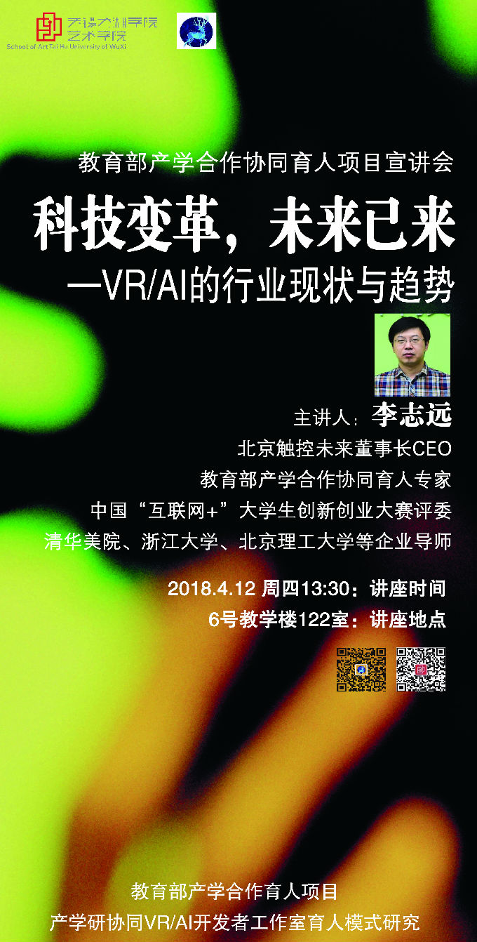 本网讯 4月12日下午1:30,艺术学院在6号楼122教室举办了艺术学院“2018学术活动周”之教育部产学合作项目“科技变革,未来以来——VR/AI的行业现状与趋势”报告会,本次报告会邀请了北京触控未来董事长、教育部产学合作协同育人专家、中国“互联网+”大学生创新创业大赛评委、清华美院、浙江大学、北京理工大学等企业导师-李志远先生主讲。艺术学院朱宁副院长主持活动,数字媒体系全体教师出席参与了活动。