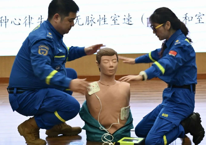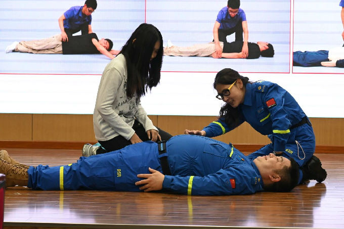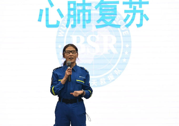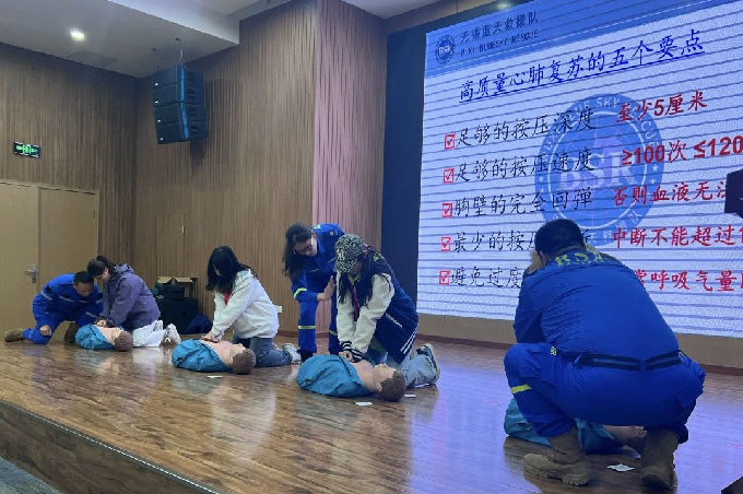 为确保活动现场参赛者的安全,志愿者需要拥有处理突发事件以及紧急救护的能力,此次出征仪式特别邀请无锡蓝天救援队的各位老师为志愿者进行急救技能培训。通过真实案例与急救知识相结合,加上生动的讲解与现场实操演练,让在座的志愿者们了解并学习了心肺复苏的急救方式以及AED(自动体外除颤器)的适用情况与使用方法。蓝天救援队为新生校园徒步定向赛提供了更加专业的急救技能,让志愿者们在志愿服务过程中遇到突发情况时也能以专业的方式进行处理。