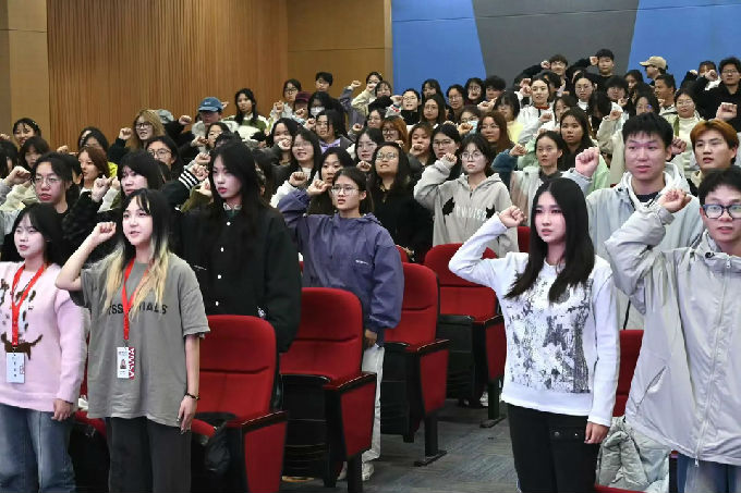 志愿者代表徐佳薇同学带领志愿者们进行宣誓:“我宣誓,在此次徒步志愿活动中,我将坚决服从指挥,遵守规定......”全体志愿者右手握拳,誓词铿锵有力,彰显了志愿者们的坚定信念和青春活力。